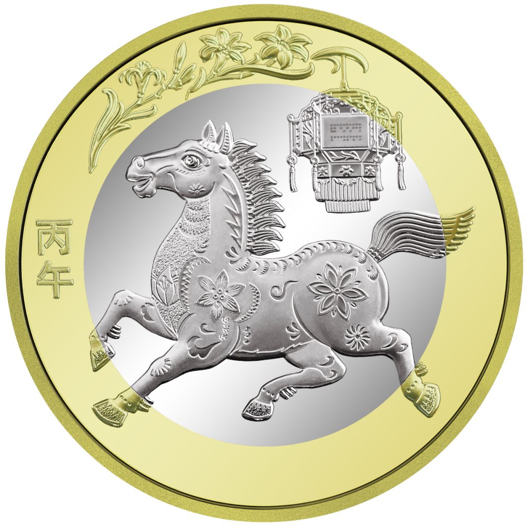 双色铜合金纪念币正面图案为“中国人民银行”“10元”字样,汉语拼音字母“SHIYUAN”及年号“2026”,底纹衬以团花图案。背面图案为中国传统剪纸艺术与装饰年画元素相结合的马形象,衬以花灯和萱草图案,币面左侧刊“丙午”字样。